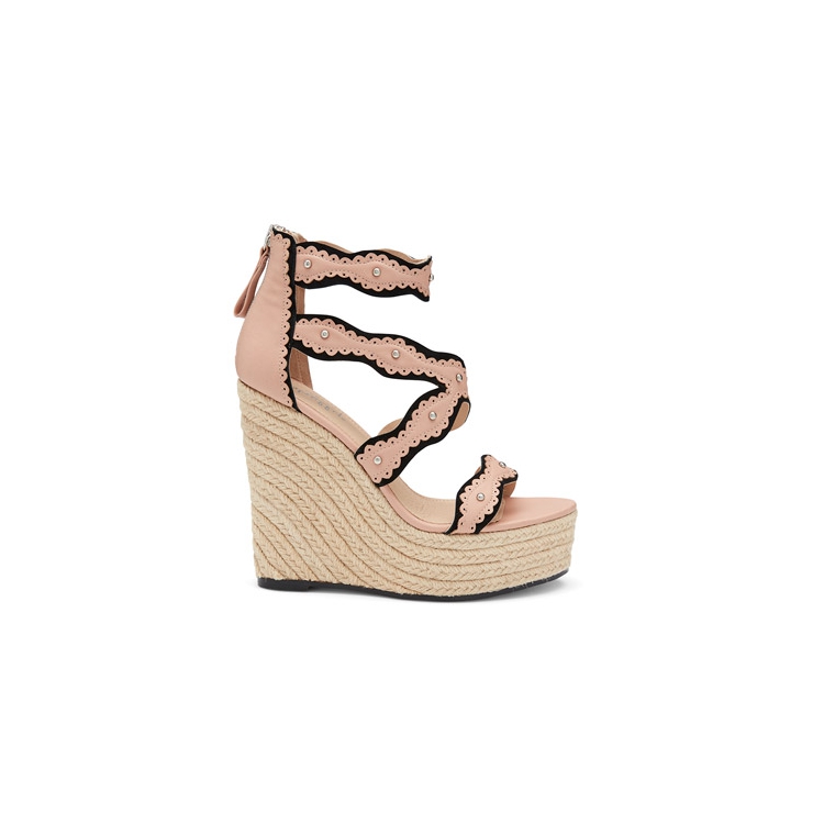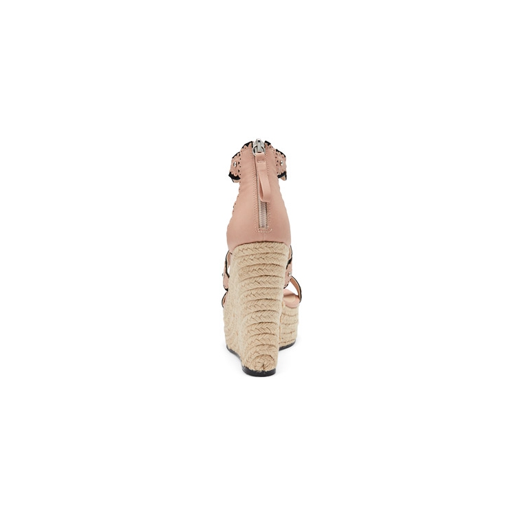 Whimsy meets style in the Monica platform wedge heels by Shelly's. These stunning and sky-high statement sandals have a rope-edged platform and are contrasted with a cut-work leather strappy upper that's studded with silver hardware and feminine perforated detailing.. The heels fasten with a pull-tab back zipper. Leather Upper, Lining and Synthetic Outsole. Platform Height: 5cm. Heel Height: 12cm